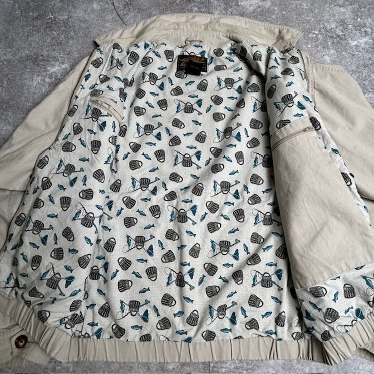 白に近いベージュなのでハンティングの持つ泥臭さが抜け、よりタウンユース合ったデザインとなっているので着回ししやすいかと思います。ライナーは魚と釣り道具のフルプリント。