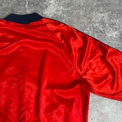 当個体は希少カラーの赤と紺色の組み合わせに光沢感が合わさった目を引く一着。リブに少し汚れがございますが、使用には問題なく、状態のかなり良いアイテムです。普段使いはもちろん、スポーツシーンやアメカジファッションにもおすすめです。