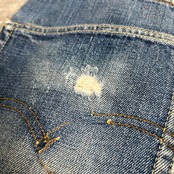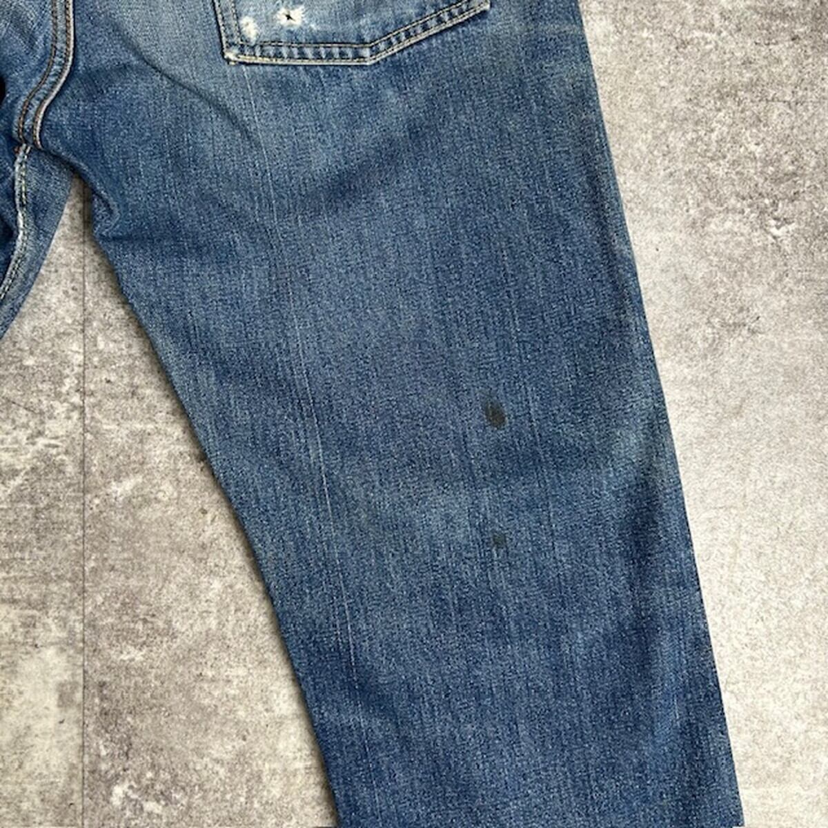 両バックポケット、ボタンフライ比翼部分に生地の擦れによるダメージ。右裾、左膝にかけて小さな穴。左脚腿から膝にかけてインク汚れ。右膝前後に黒いシミが確認できます。