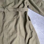 右肩付近および襟元など複数個所にインク汚れのような跡が見られますが、それもまた時を経た証として、このコートの物語を語る一部となっています。全体として着用には問題なく、ヴィンテージらしい奥行きある表情を存分に楽しめる一着です。