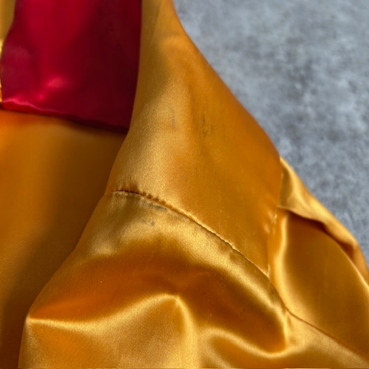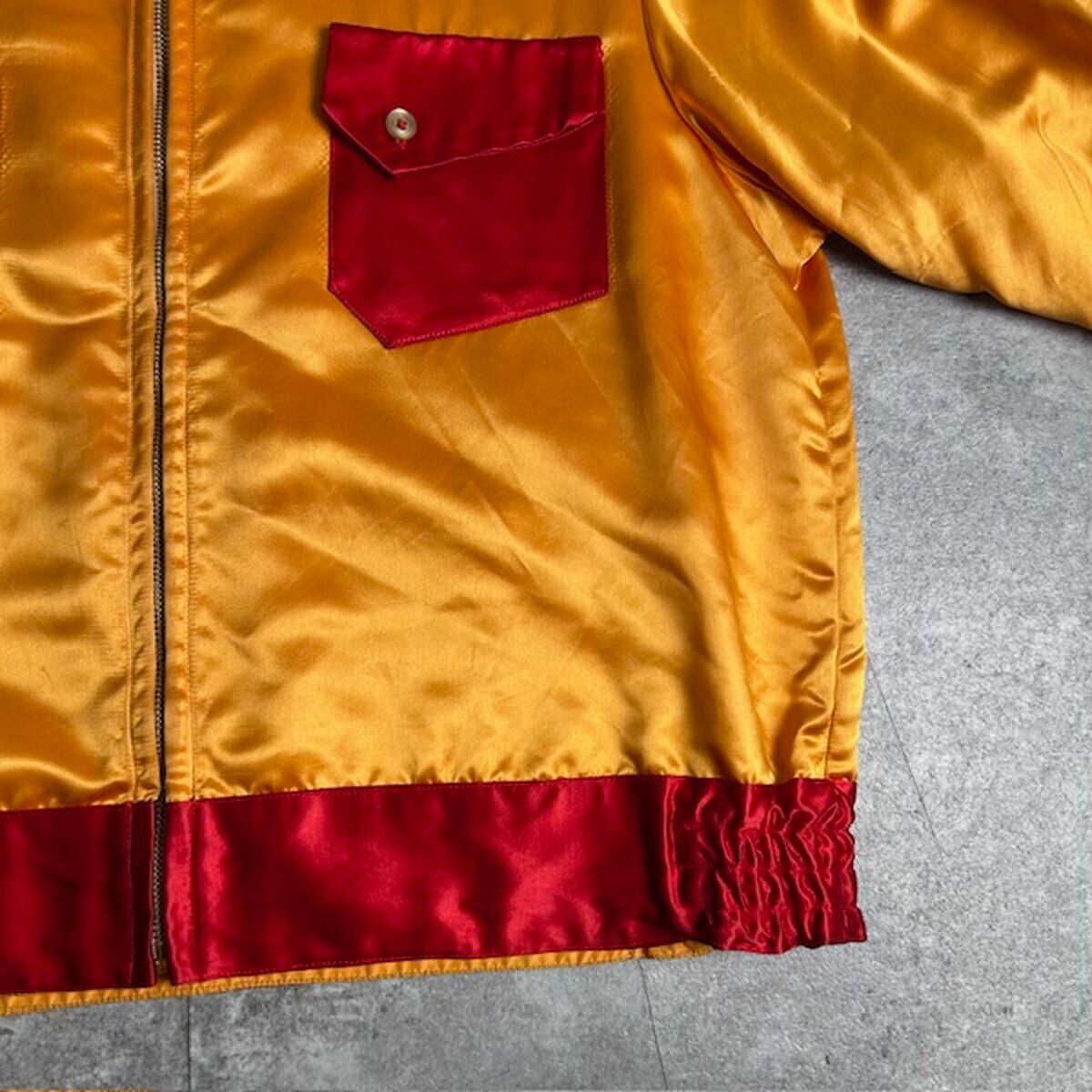 ポケットや襟のレッドカラー部分にはレーヨン素材を使用しており、異素材の組み合わせが際立つヴィンテージらしい仕上がり。
