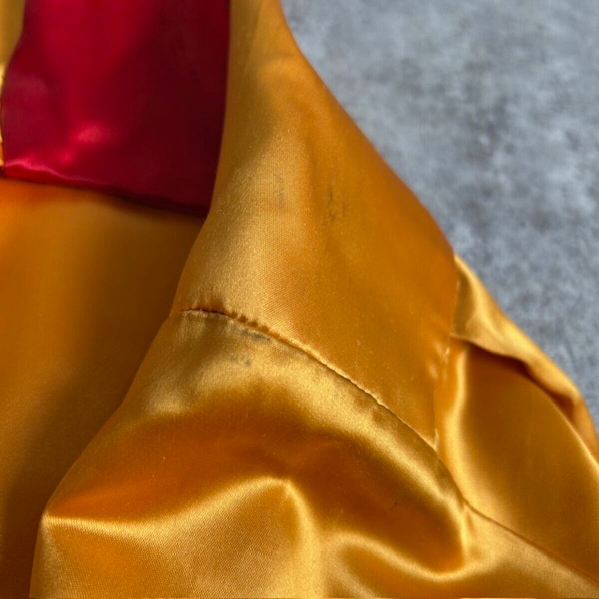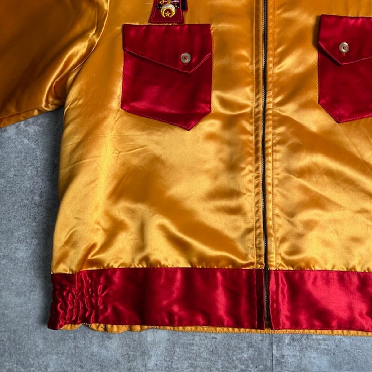 鮮やかな オレンジ×レッドの配色 が印象的で、バックには存在感抜群のチェーンステッチが施されています。フリーメイソンのロゴとともに、団体名・拠点地と思われる文字が丁寧に刺繍され、