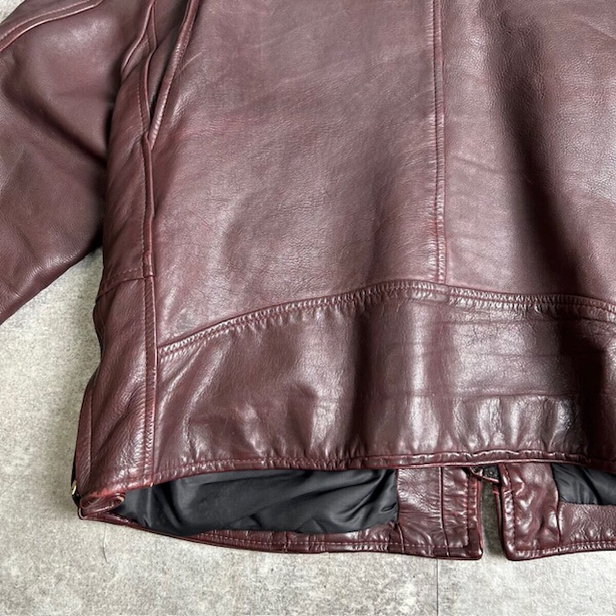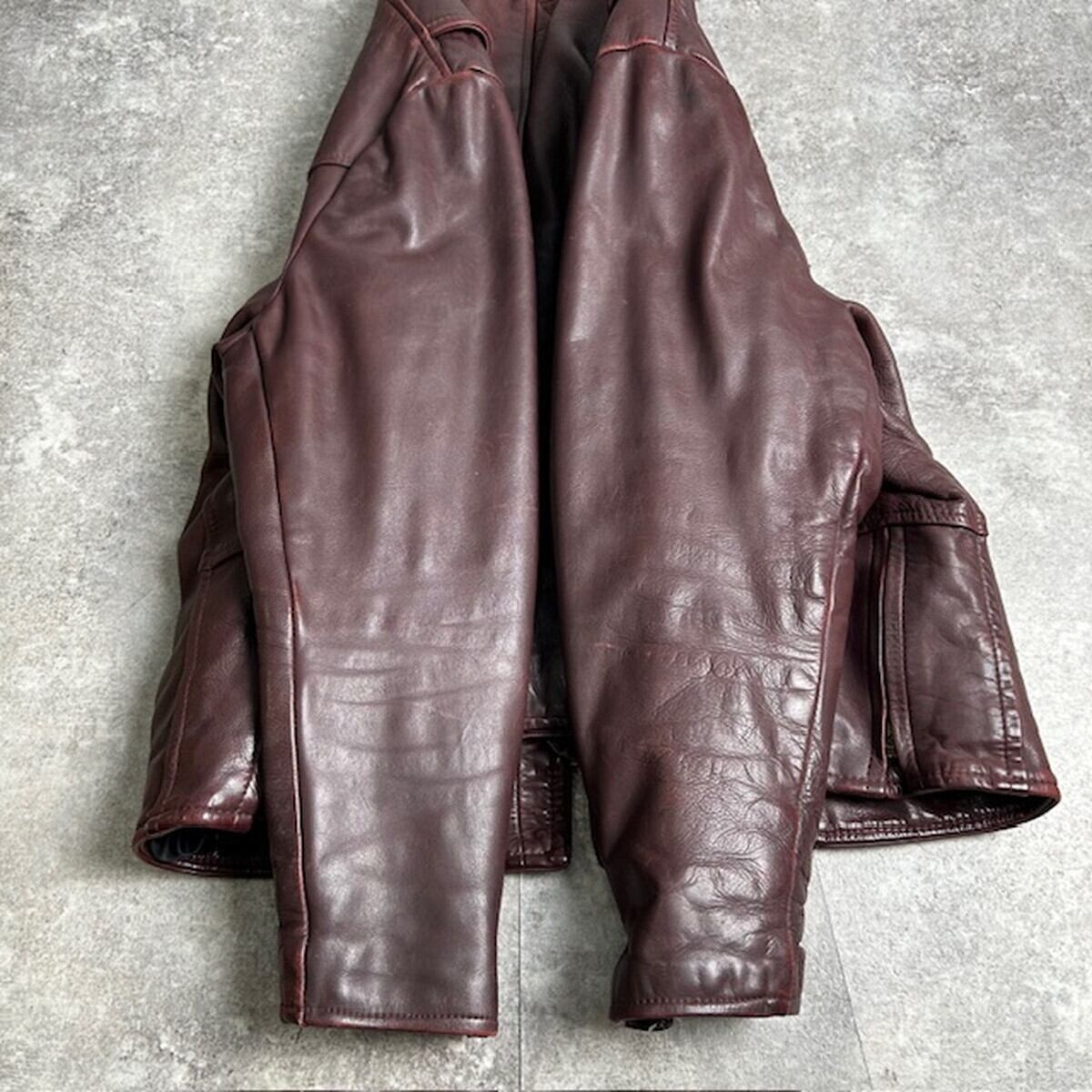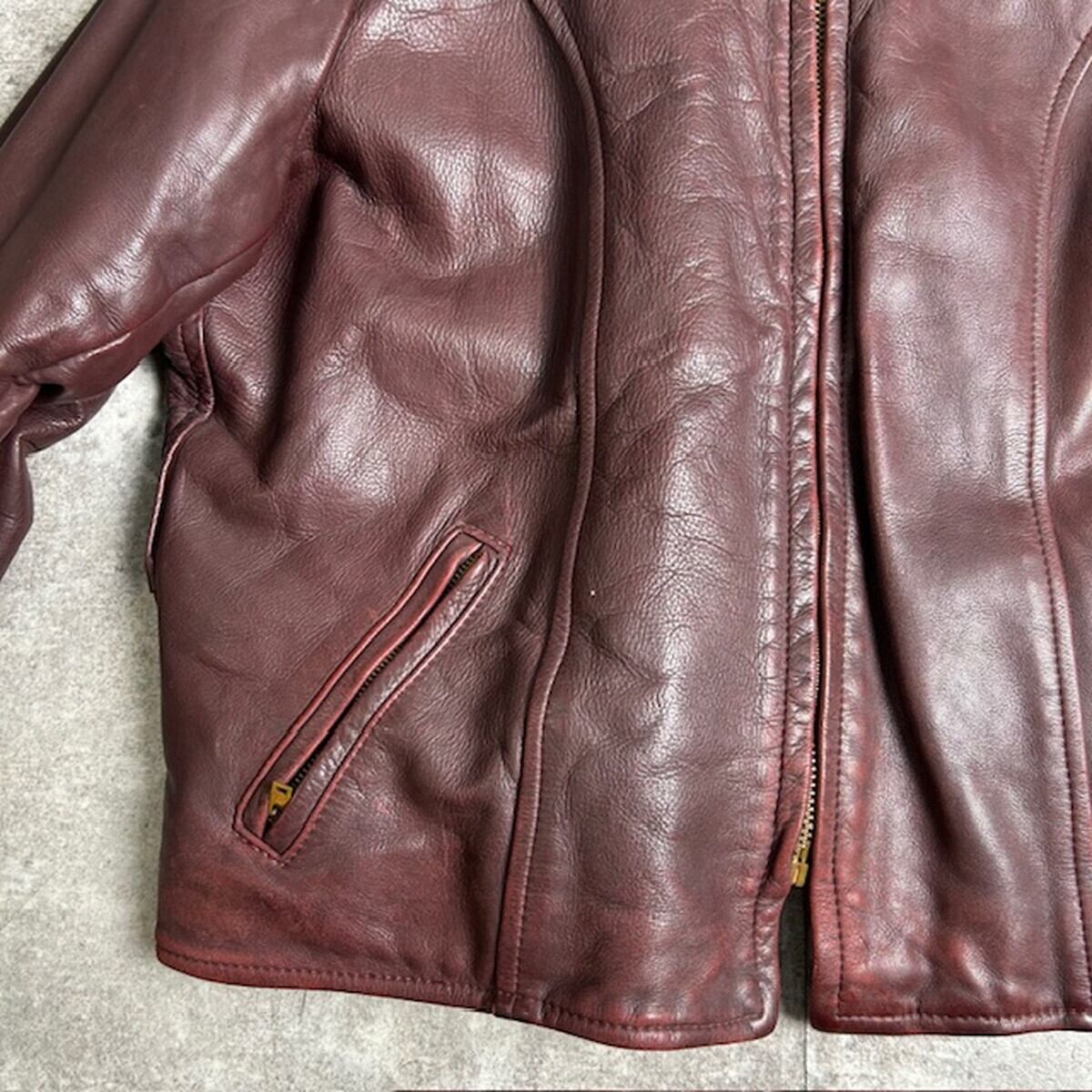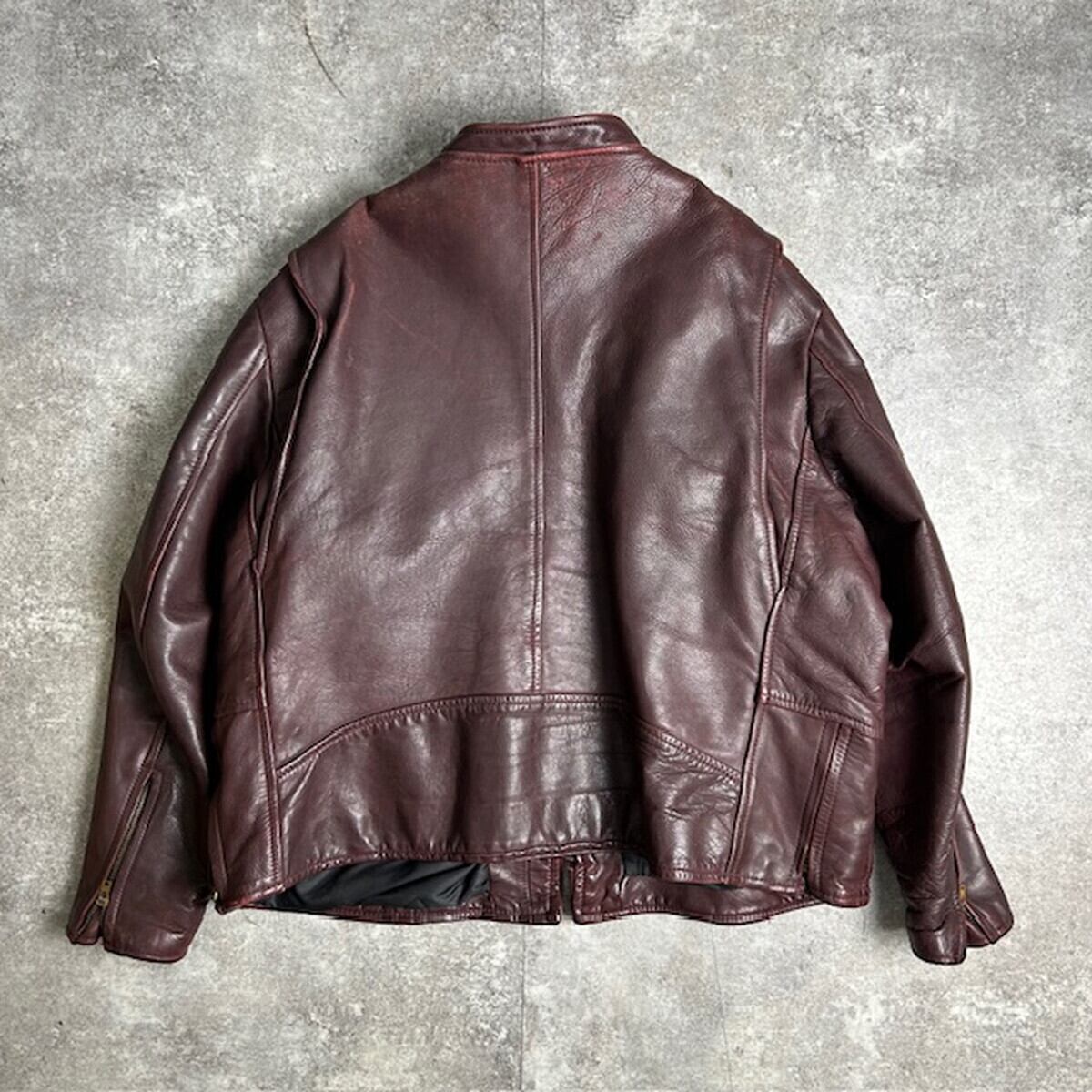 70~80年代頃のレザーライダースジャケットです。深みのあるバーガンディカラーが特徴で、ヴィンテージならではの雰囲気を醸し出しています。レザー特有の質感と、長年愛用されてきたことによる風合いが魅力です。状態ランクCで使用感やスレなどございますが、着用には問題なくまだまだ使っていただけます。