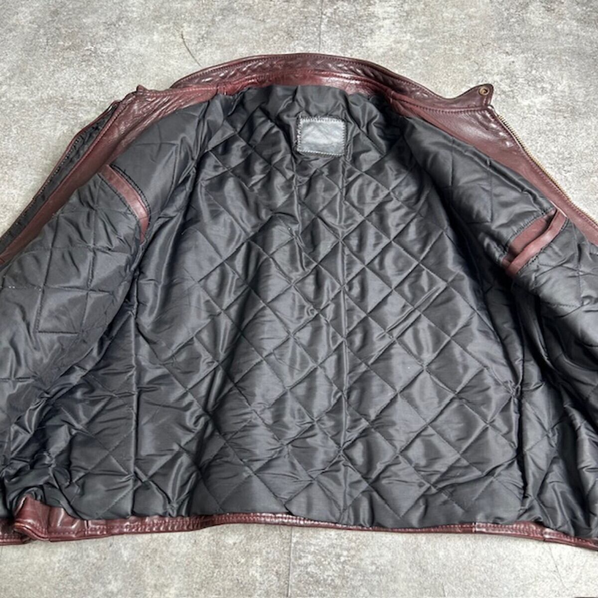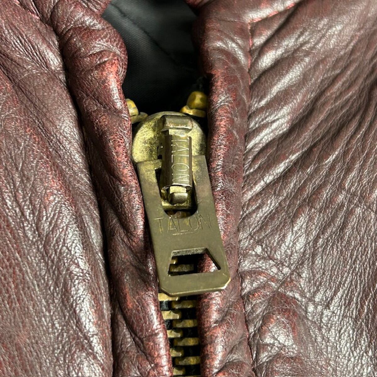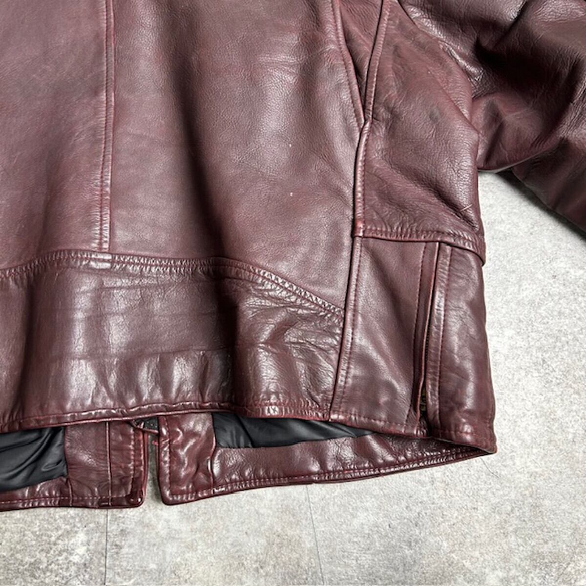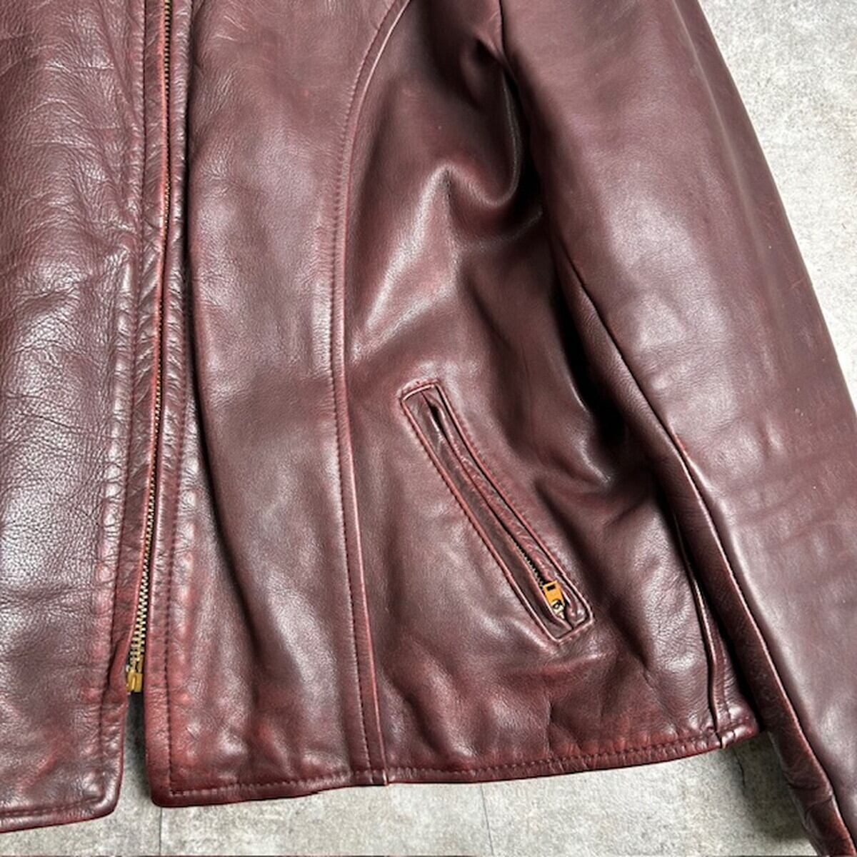 70~80年代頃のレザーライダースジャケットです。深みのあるバーガンディカラーが特徴で、ヴィンテージならではの雰囲気を醸し出しています。レザー特有の質感と、長年愛用されてきたことによる風合いが魅力です。状態ランクCで使用感やスレなどございますが、着用には問題なくまだまだ使っていただけます。