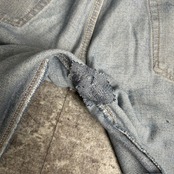 両ポケット口や裾まわりには擦れがあり、両膝、右バックポケット、股部分にかけてリペアが施されています。