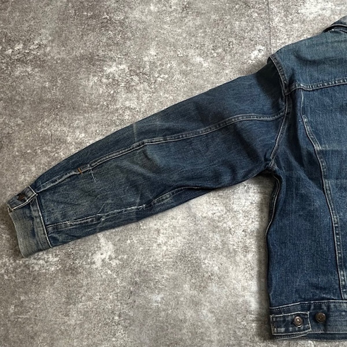 スレが起こりやす襟ぐり部分にリペアは施されておりますが、綺麗にたたかれておりますので目立いずらいです。使用感などはありますが、48サイズと大きいサイズはなかなか見つからないと思いますのでお探しだった方は是非。