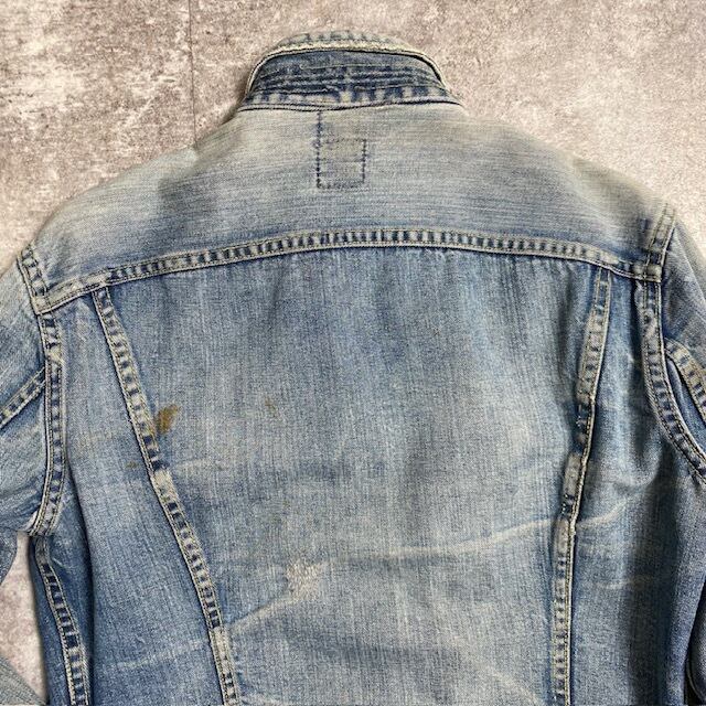 全体的にフェード感やダメージがあり、両袖、裾、背面などにシミ汚れがあります。写真でご確認ください。左腕にワッペンが付いていたような日焼け跡が見られます。背面の裾についているボタンが全て欠損、左のボタンループはつけ直しされております。
