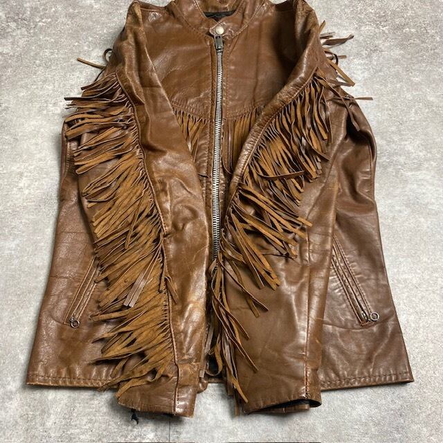 胸元と、両腕、背中にフリンジが付いております。肩、ひじ、裾等の関節部分に擦れやひび割れが見られます。両袖と首元の裏地に破れ有り。両袖口の縫製部分に破れが見られます。右袖口付近に大きなダメージが見られます。両脇下に付いている金具のようなものが取れかけております。背面右脇付近にシミ汚れが見られます。