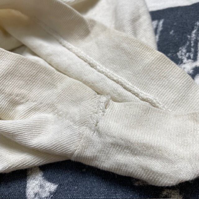 右袖口と背面の裾に破れがあります。首周りと背面中央、左袖、左肩、フロントプリントの下にシミ汚れが見られます。