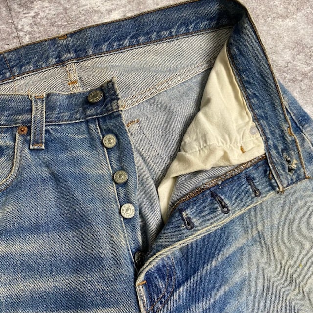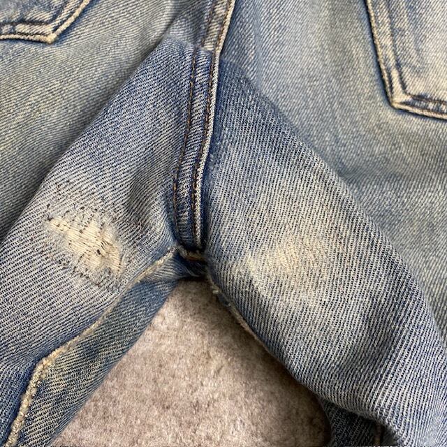 股下に擦れによるダメージが見られます。お尻にダメージがありリペアが施されております。全体的にフェード感があり、黄色い汚れがありますが雰囲気のある1着となっております。