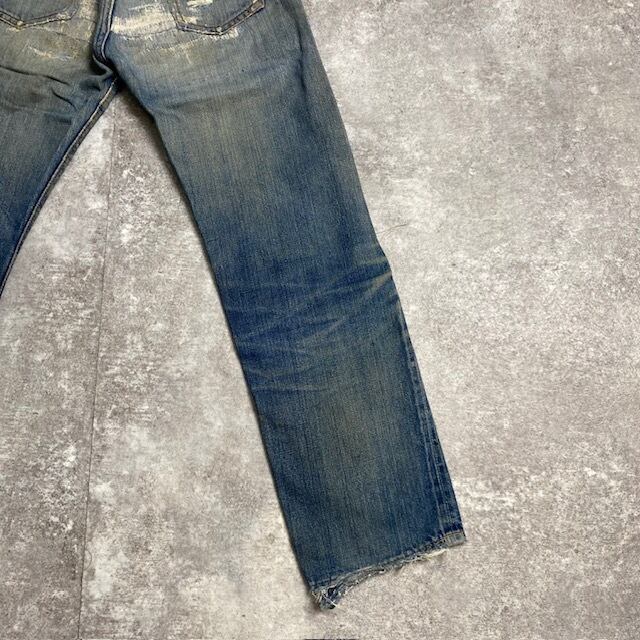 両膝とお尻、フロント右ポケットにリペアが施されております。両膝、裾、フロントポケット入口、バックポケット、フロントフラップ、股下、右足のアウトシームの部分にダメージが見られます。