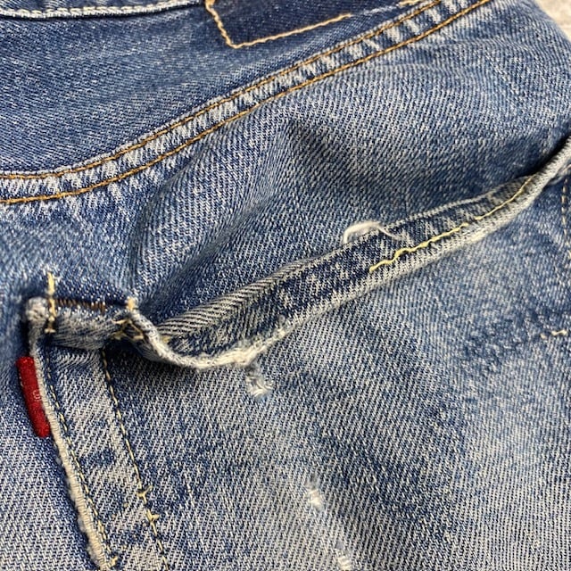 1960年代、Levi's 503BXX 最終 デニムパンツです。刻印W、赤耳、赤タブ、リペア、アウトシーム裏シングル×シングル、バックポケット裏シングル。