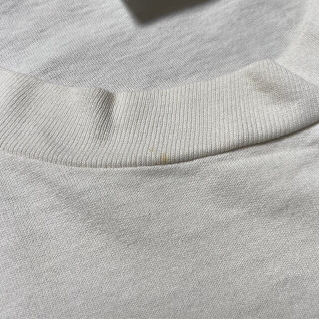 首周囲と左袖、背面中央近くにシミ汚れが見られます。その他に目立ったダメージ等はなく首周りのヨレもありません。