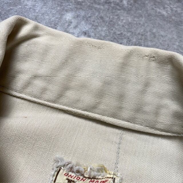 1960年代、Lee 100-J WESTERNER コットンツイルジャケットです。首タグ®、MR表記無し、ピスネームMR表記無し。首周りとフロント右ポケット、左ひじ上、両袖に軽いダメージがあります。フロント右ポケット入口付近、胴回り、両袖、両肩、背面中央辺りにシミ汚れが見られます。