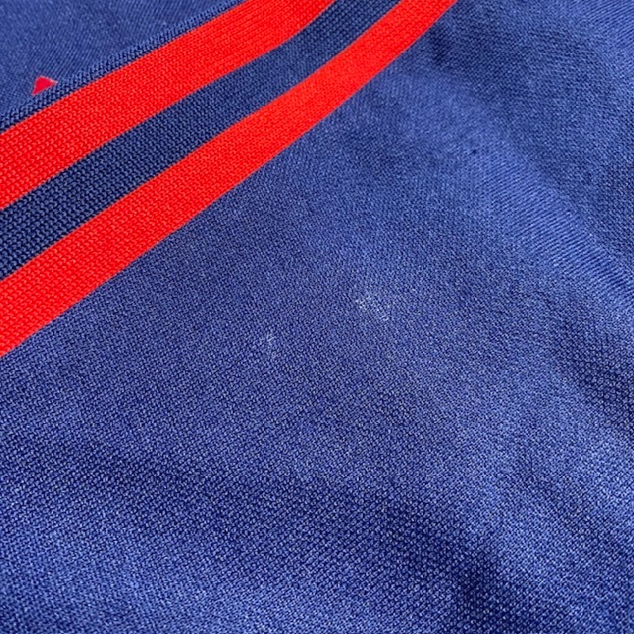 左胸元にフロッキープリントでロゴがデザインされておりますが所々はがれております。フロント右ポケットの下あたりと右袖のライン部分、左袖の肘に汚れが見られますがあまり目立ちません。