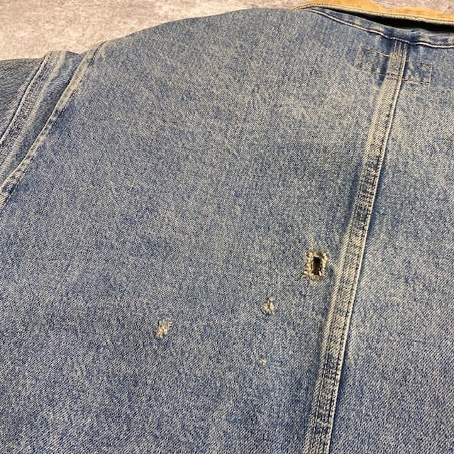 全体的にダメージや破れがあります。写真でご確認ください。両袖の肩後ろの縫製部分いフェード感があり黄ばみ汚れが見られますが雰囲気のある1着です。