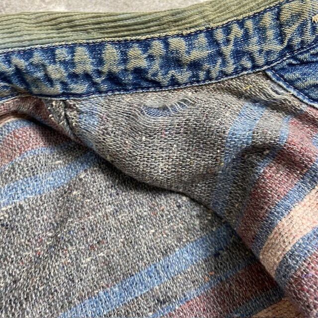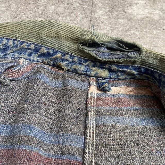 首周りと両袖口、右ポケット入口、裾、右腰辺りに破れが見られます。