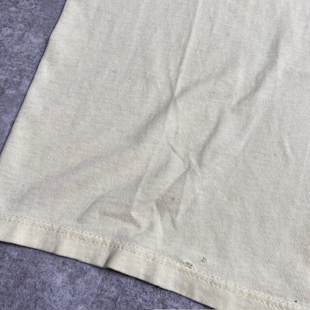 フロントプリント付近と胴回り、左袖、裾にシミ汚れが見られます。フロントプリントにひび割れがあり、裾に破れがあります。