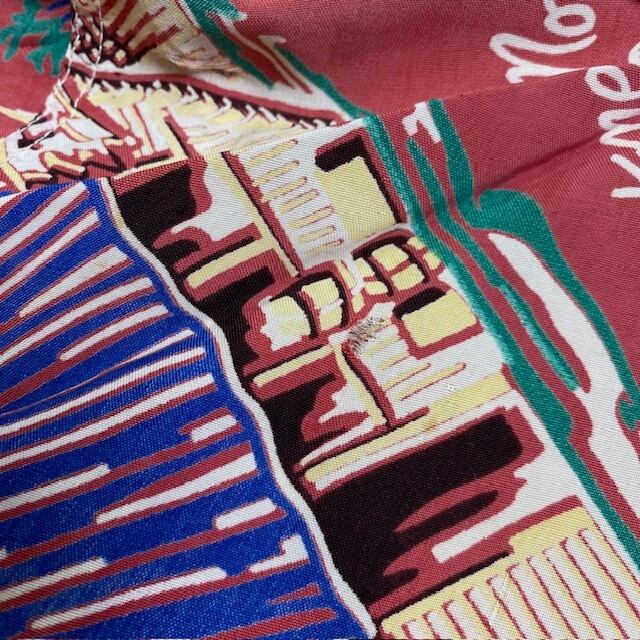 1950年代 『SOUTH SEA TRADER』の半袖アロハシャツ。40年代から50年代にハワイアンシャツデザイナーとして活躍したジョン・メイグスによるアートワーク『サウス・シー・トレーダー』。ほぼ同時期の有名な彼の作品として『GAUGUIN WOODCUT(ゴーギャン・ウッドカット)』があるほどポール・ゴーギャンに憧れていたデザイナーで、ゴーギャンが活躍したタヒチや南国の島々をテーマに描いたものがこちらの作品です。作品(柄)の中に見られる貿易商トレーダー・ジョーンズは一説によるとジョン・メイグス本人をモデルに描かれているとのこと。サンサーフでも復刻されている非常にコレクタブルな1着です。タタキリペアあり、全体的にフェードが見られ、一番下のボタンが付け替えられております。実寸サイズはLからXL程。