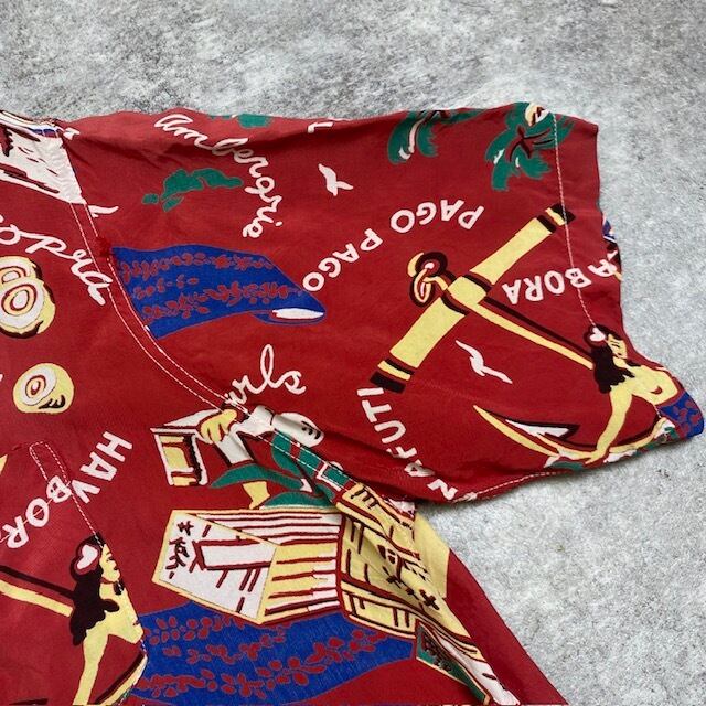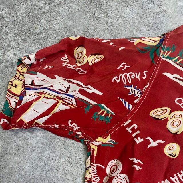 50's 50s レッド 総柄 実寸L~XL vintage 50年代 ビンテージハワイアン オリジナル ジョン・メイグス サウス・シー・トレーダー ポール・ゴーギャン 開襟 オープンカラー ループカラー 403U
