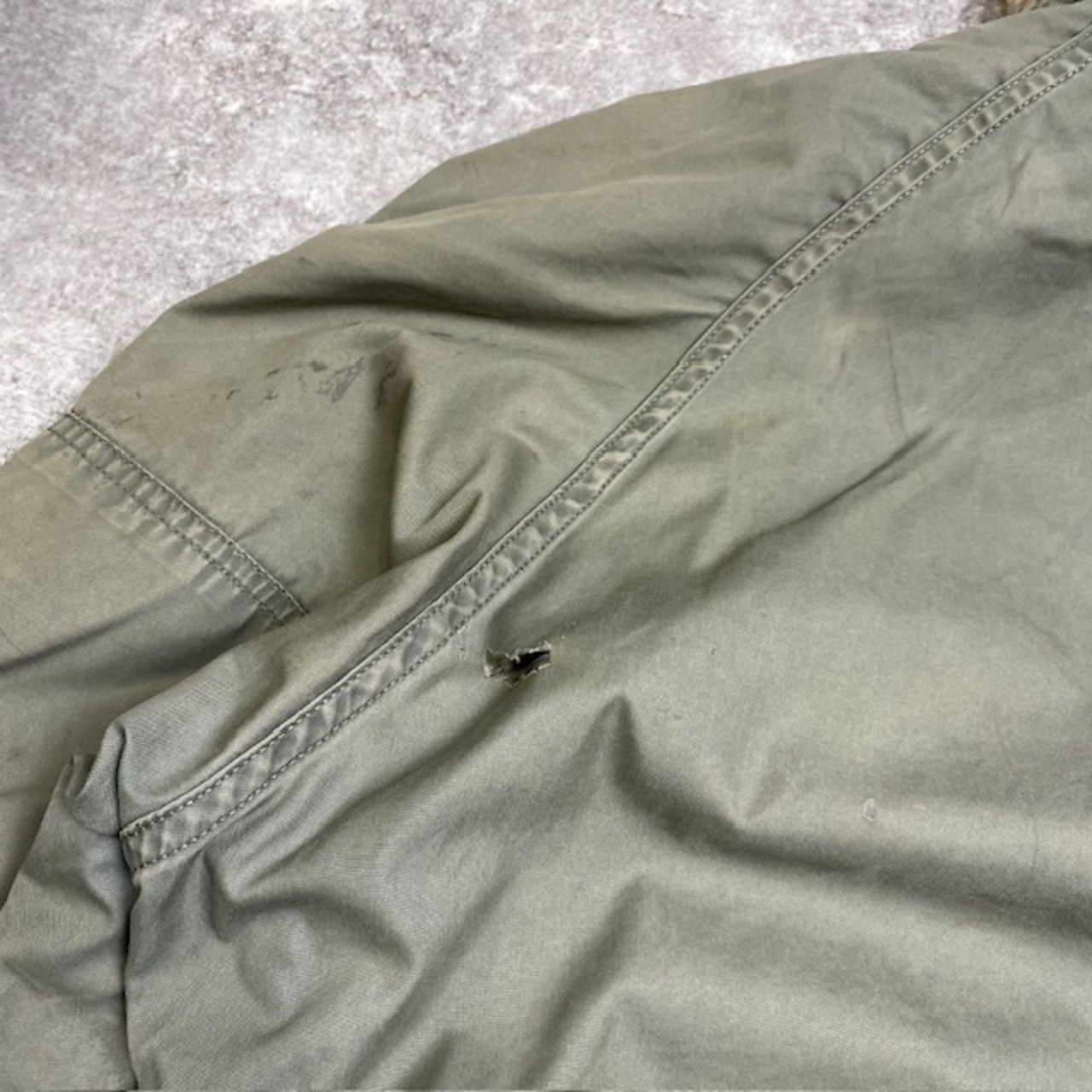 首周りや肩、ポケット付近、両袖口、裾にダメージが見られます。