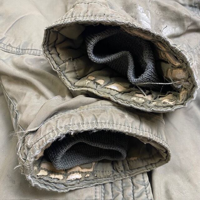 フロント右ポケット近くと左袖口、左裾に緑色の糸でリペアが施されております。